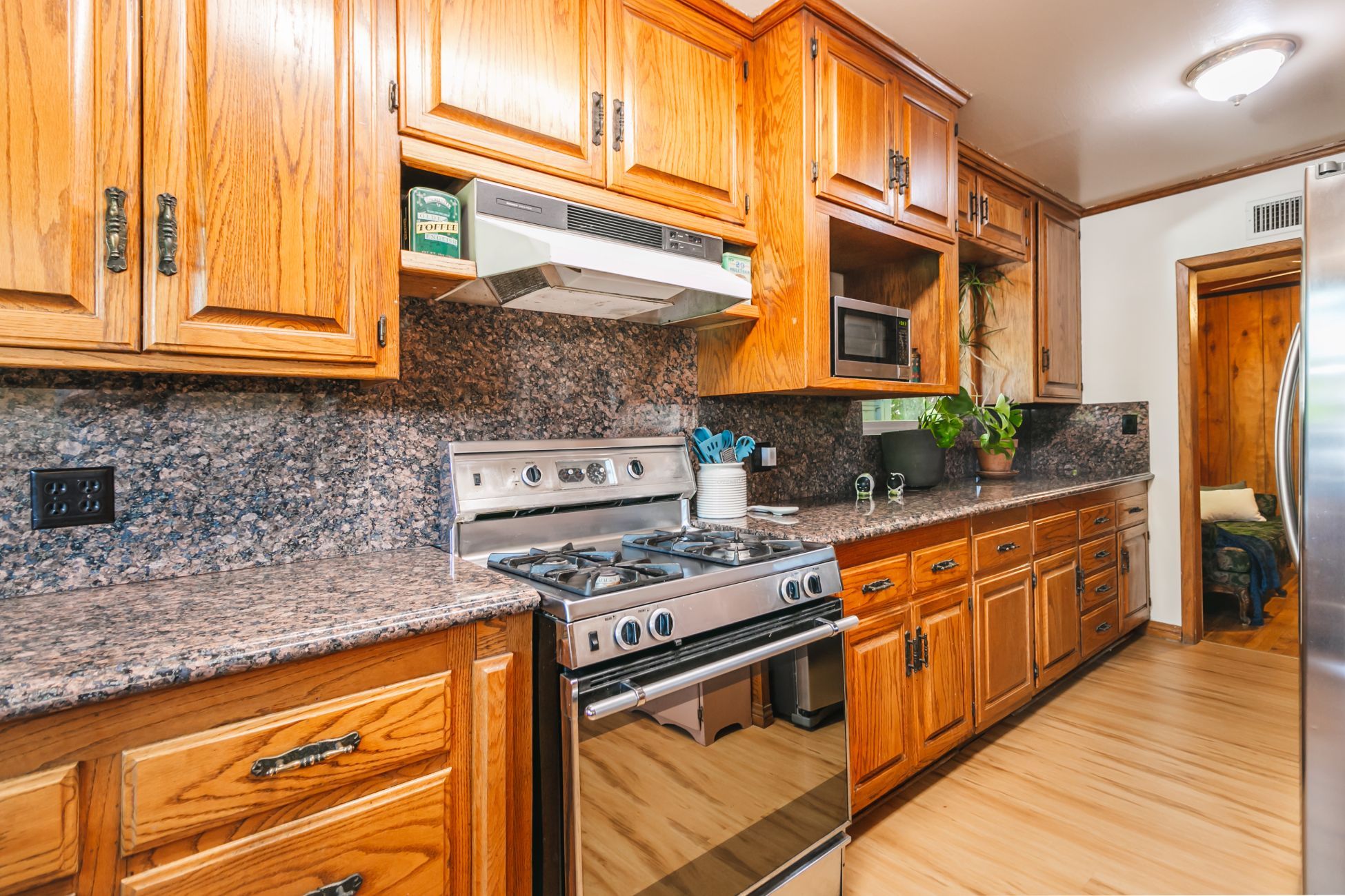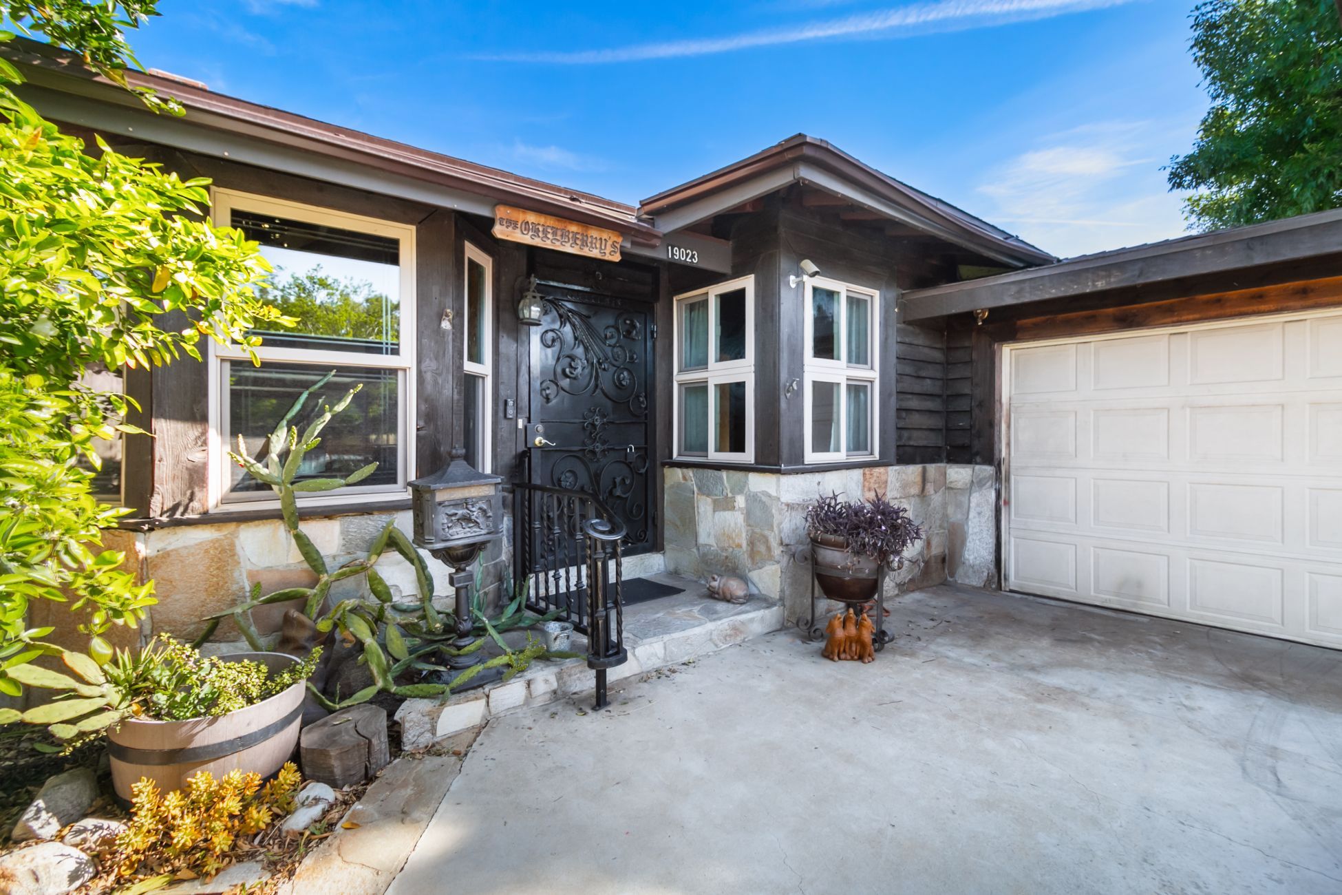 Large family home with lots of closets and storage space! Country kitchen has many custom-built solid wood cabinets, dramatic dark grey granite counter tops, modern wood ceiling and faux wood floors. Beautiful decorator windows with an embedded feature in the bay windows. Dishwasher, slide-in, self-cleaning range and hidden two-basket garbage cabinet. Built-in pantry. Dining room/Living room combination with an Oakley Rock fireplace. Huge family room with closeted laundry area, walk-in pantry and separate closet great for toys and games. Built-in bookshelves and desk. Master bedroom suite with large walk-in closet, smaller closet and a wall of built- in storage. Distinctive patterned wood hardwood flooring. Beautiful master bath with double sinks, grey marble countertops and gorgeous leaded-glass storage cabinets, walk-in shower. Master and two other bedrooms on the main floor. Upstairs has two generous-sized bedrooms and a bathroom with shower. One of these bedrooms is being used as an office. Attached two-car garage and an un-attached carport. Sliding glass door leads to large covered patio with wood deck suitable for entertaining. Lots of real-wood paneling protects walls from smudges and wood base and crown molding add elegance. Ceiling fans and hardwood floors. Central heat and air. Tankless water heater--too many special features to list. Orange, Pomegranate, and other fruit trees. Approx. 2 mi. to Northridge Hospital, 3 mi. to Northridge Mall and 5 minutes to Starbucks. Call for an appointment to tour.