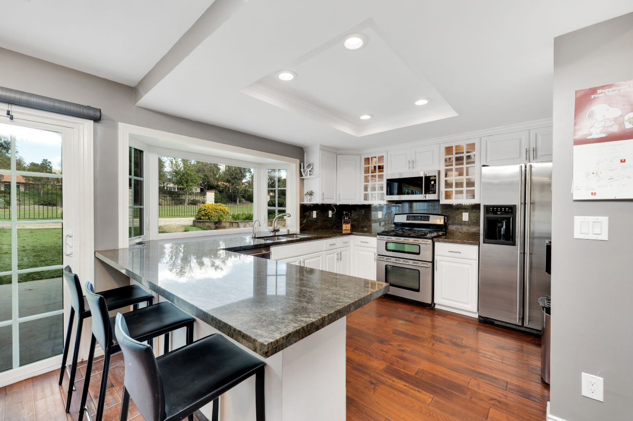 This quintessential Porter Ranch Dream Home has just become available. It sits on the 5th hole of the prestigious Porter Valley Country Club. It features gorgeous curb appeal, an oversized driveway and a 3-car garage. Beautifully laid out and well maintained, this home boasts hardwood floors, a large living room with Cathedral ceilings and a cozy fire place. The updated kitchen presents granite countertops, solid Alder wood cabinetry, stainless steel Jenn Air/GE Monogram appliances and an Breakfast bar. It is open to the family room with gorgeous views of your Entertainers’ Paradise. It includes a golf course view, a heated Quartz Tech Pool and Spa, and a built-in Lynx BBQ island. There is a convenient app that controls the outdoor lights, waterfall and Jacuzzi functions. The first floor bedroom makes a perfect room for a teenager or in-laws. As you go up the custom rod iron stairway, you arrive at your private master bedroom suite. It includes vaulted ceilings, a walk-in closet and a completely remodeled en-suite bathroom. The other two bedrooms are nice sized and have lovely golf course views. The newly remodeled full bathroom boasts Quartz countertops and a large tub and shower. This home is situated in a highly desired school district, and is conveniently located near several parks and the new shopping center “The Vineyards”. Don’t miss out on this gorgeous Porter Ranch view home!