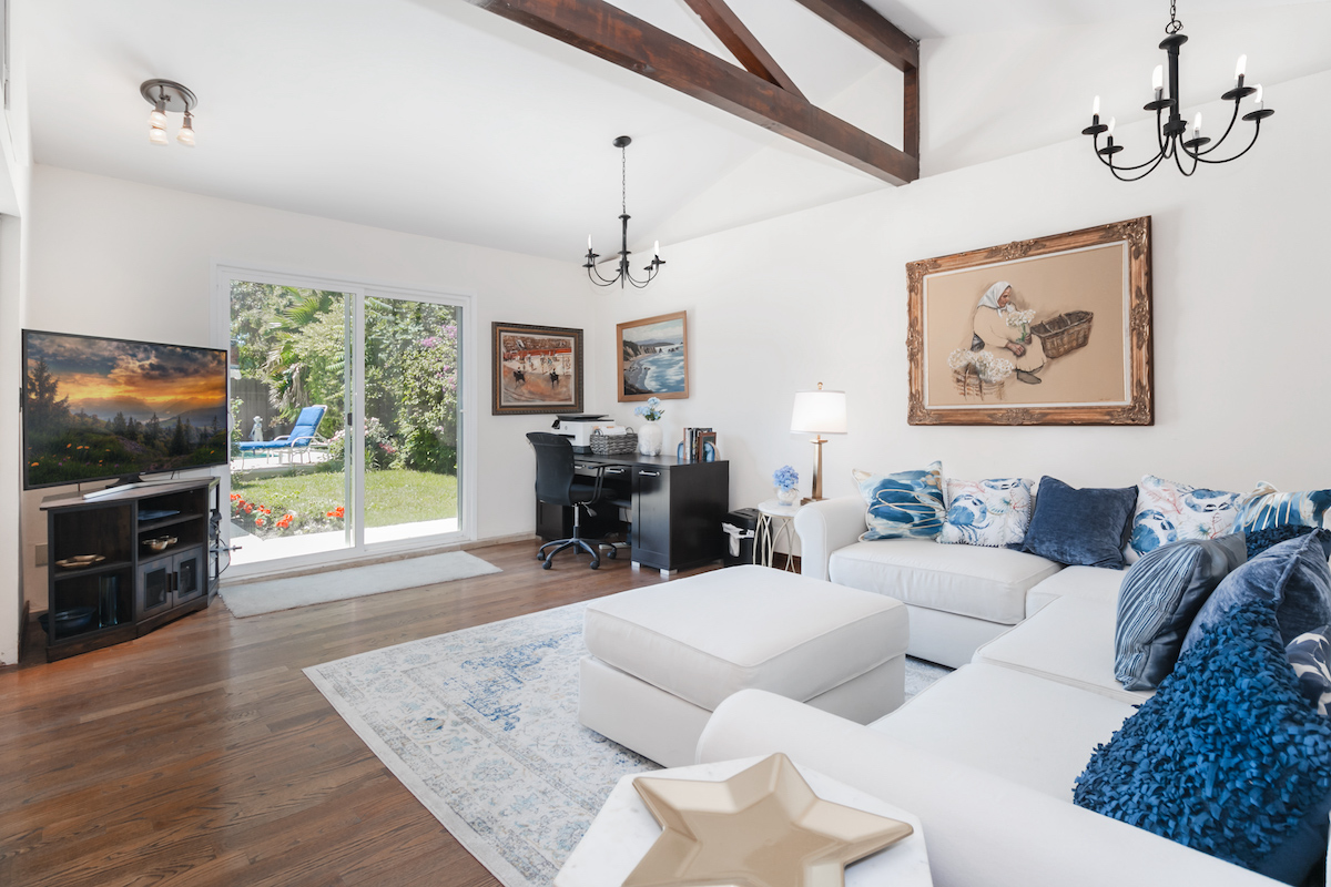 Stunning West Hills Adjacent Pool Home! Must See! Beautifully updated 4 bedroom or 3 bedroom and family room in a family neighborhood. Newer roof, newer windows, newer paint, hardwood throughout. Cook's dream! Large, updated kitchen with Quartz countertops, single country sink, gold faucet with pull-down spray, 6-burner stove with grill option and separately controlled warmer drawer. Lots of cabinets and pantry. French Windows open to the back patio and look out to the pool and the beautifully landscaped private backyard. Family room/4th bedroom has a beamed cathedral ceiling and a wall to wall storage unit. Both living room and family room have recessed lighting, base and crown molding and neutral cream color paint. Dining area features gorgeous new contemporary chandelier. Primary suite and two other bedrooms are large enough for a king-size bed. Primary bedroom has two closets, overhead fan and ensuite bath. Bath has new golden 5- light fixture, new golden faucet, golden "rain" showerhead, clear glass shower door, built-in storage tri-fold mirror, marble countertops and floors. Hall bath also has marble countertops and floors with modern brushed nickel mirror and 5-light fixture. Kohler water-saving step-in tub with "rain showerhead" and hand-held convenience option. Front and back patios provide plenty of room for entertaining. Large back patio has outdoor fan with string solar lights, fire pit and sauna. Large pool and large private yard with sprinklers. Near shopping malls with lots of shopping choices, movie theaters and walking distance to Starbucks. Convenient to Trader Joe's, Ralph's, Pavilion's, Amazon Fresh, Whole Foods, Sprouts, and Field's Market Near fine dining, family restaurants and fast food choices. Several private schools nearby. |