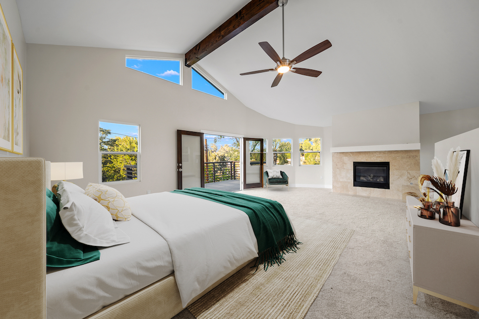 Each bedroom has its own Large step-out water-proofed balcony with views of the Hollywood Hills, and room for a couch, table and chairs. Dual Master suites ( One Up, One Down ) each with its own gas fireplace plus a third gas fireplace in the living room. Vaulted ceilings with recessed dimmer lights. Entertain in the kitchen around Quartz center island with a 6-burner gas stove, brand new stainless steel appliances including convection / air fryer oven, dishwasher, bespoke refrigerator and a built-in microwave, with lots of kitchen cabinetry. New beautifully engineered hardwood floors, smooth walls, smooth stucco, new water heater, and separate laundry room with washer and dryer.