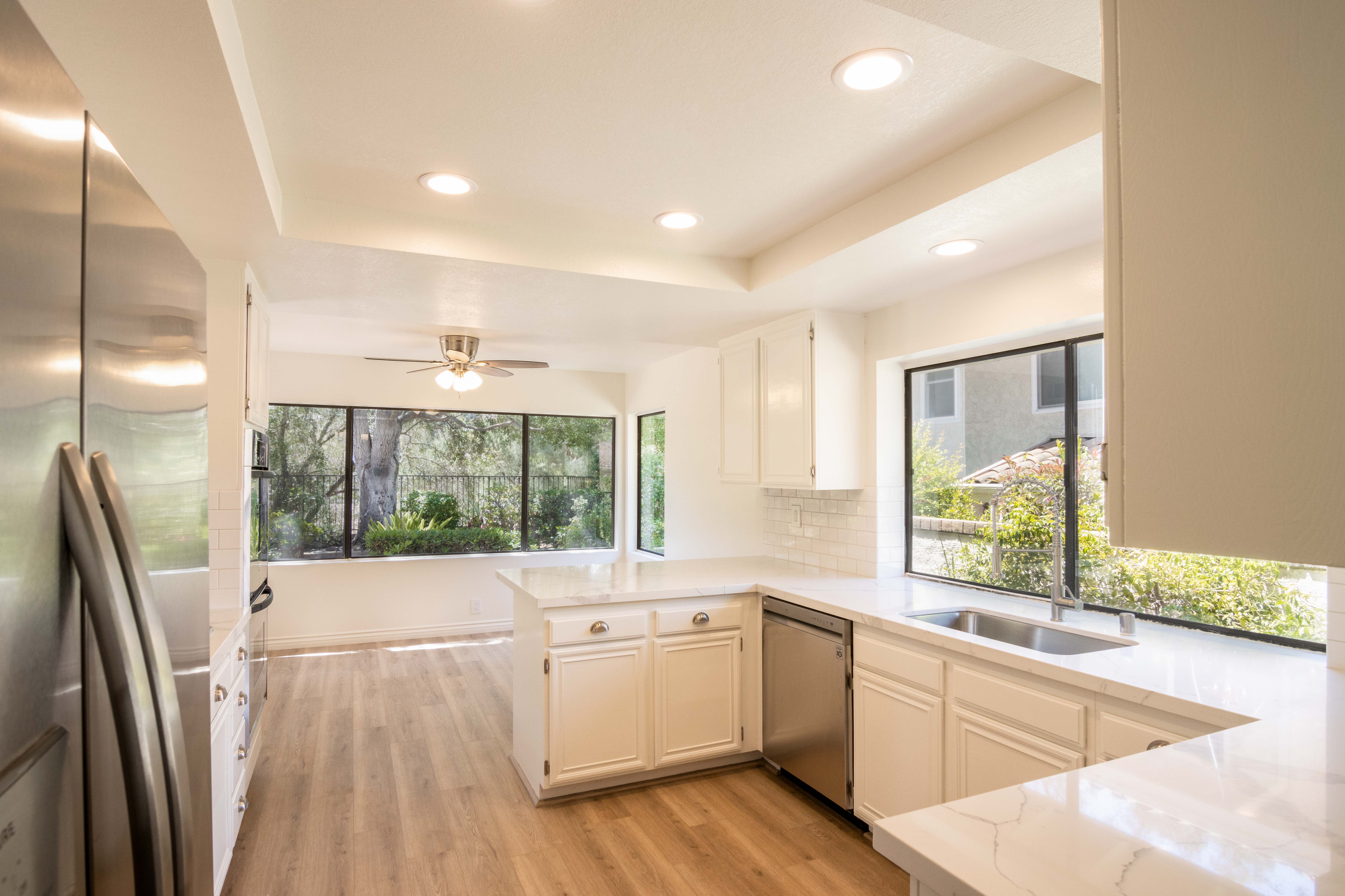 Golf Course View! Welcome to this beautiful 4 bedroom, 2 bath home in Thousand Oaks! Knock-down ceilings, fresh paint, "all" new vinyl flooring, recessed lighting, new kitchen "quartz" countertops, with a "breakfast bar" and a large breakfast nook, stainless steel appliances, new dishwasher, elegant backsplash, large formal dine, out back, gorgeous setting, newer patio cover, colorful plants, large spa, Saltillo tile and brick floor, golf course view. The huge 3-car garage is perfect for loads of storage or a "man cave. Hurry, this home won't last.