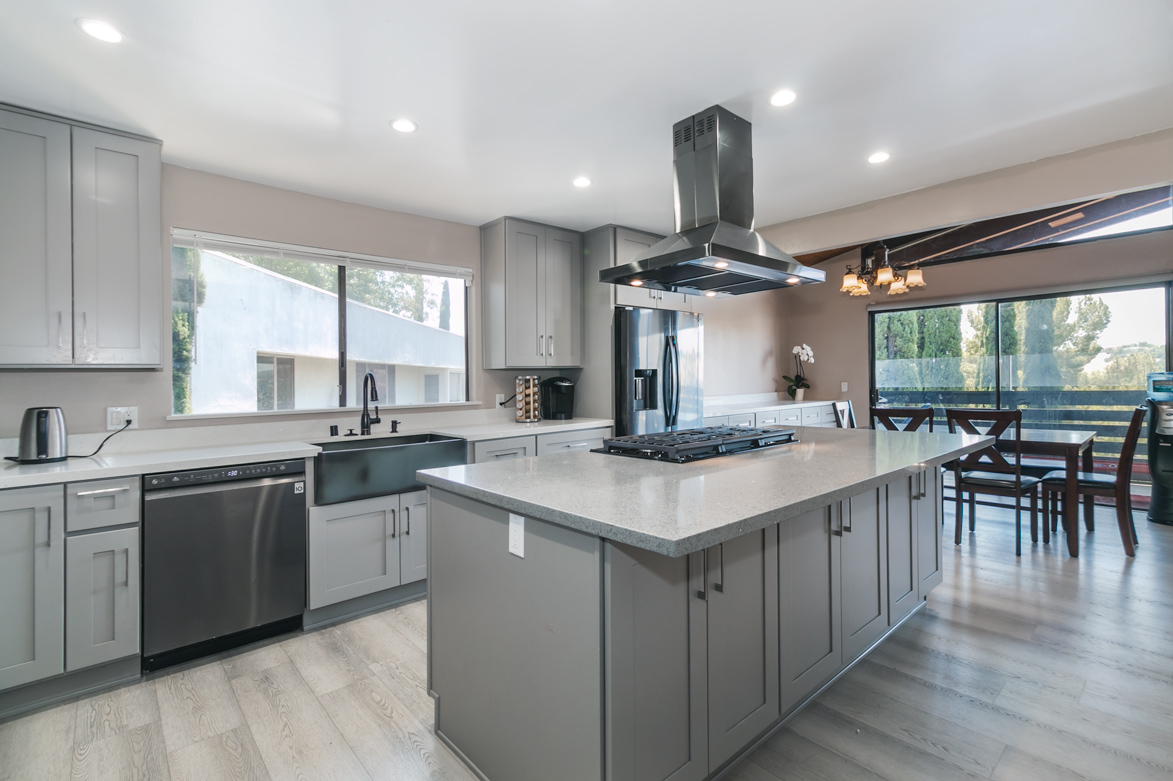 Rare opportunity to have this outstanding five bedroom/four bathroom, South of the Boulevard, Woodland Hills Home. Incredible updates throughout. Don’t miss the multi-purpose bonus room downstairs. There is an abundance of natural light and spacious living on the first floor with sky lights in the living room and kitchen. The main entry leads to vaulted wood beamed ceiling in the living room with fireplace. This opens to a large chef's kitchen with center island and stainless-steel vent top. The kitchen has a farmhouse sink, all newer cabinetry, plus plenty of cabinets space; very convenient for holidays and parties. The first floor also has a guest bedroom and 3/4 bathroom. The second floor has 3 bedrooms, each with fantastic views and access to a private balcony! The very spacious master suite has walk in closet, a fireplace, separate tub and shower and a bonus sauna. The other bathroom on the second level features a jetted tub. This house also has a second floor laundry area with new washer and dryer included. The backyard is immersed in nature complete with fruit trees and a large concrete area. There is plenty of room left for a vegetable garden or a quiet fabulous retreat to read, paint or play. This peaceful home is a great combination of luxury, location, and spectacular western sunsets. Located minutes to the Village, Westfield Mall and Topanga/Malibu beaches.