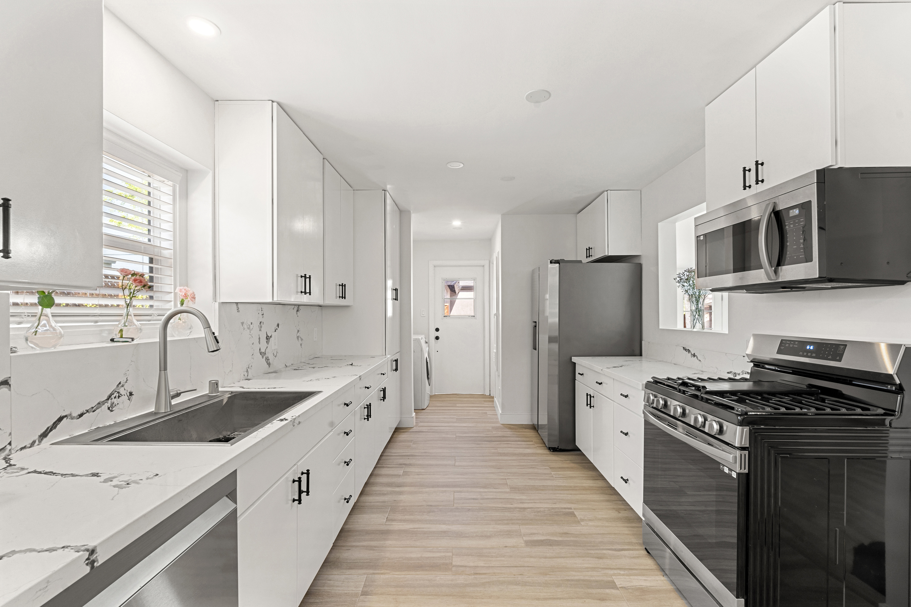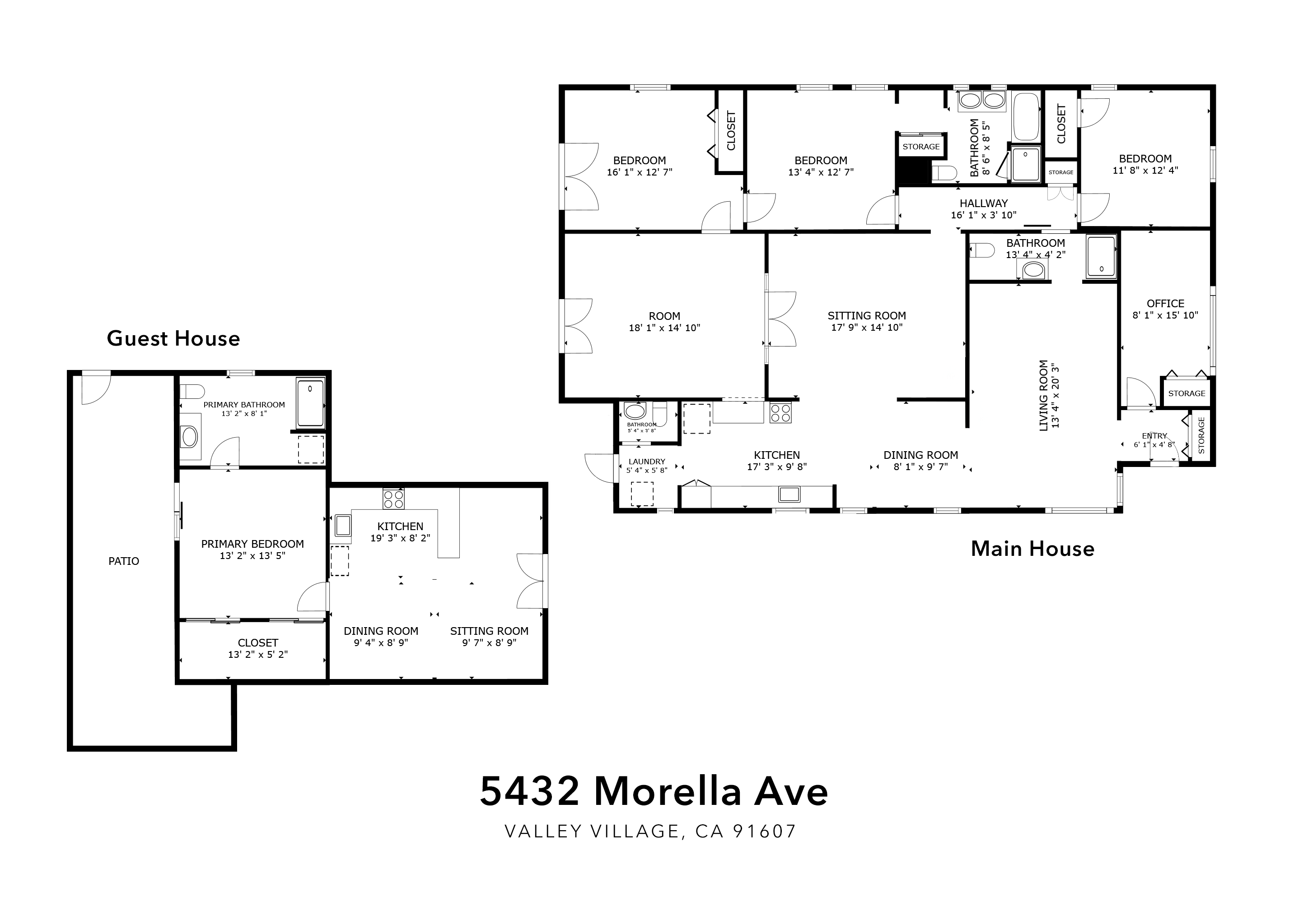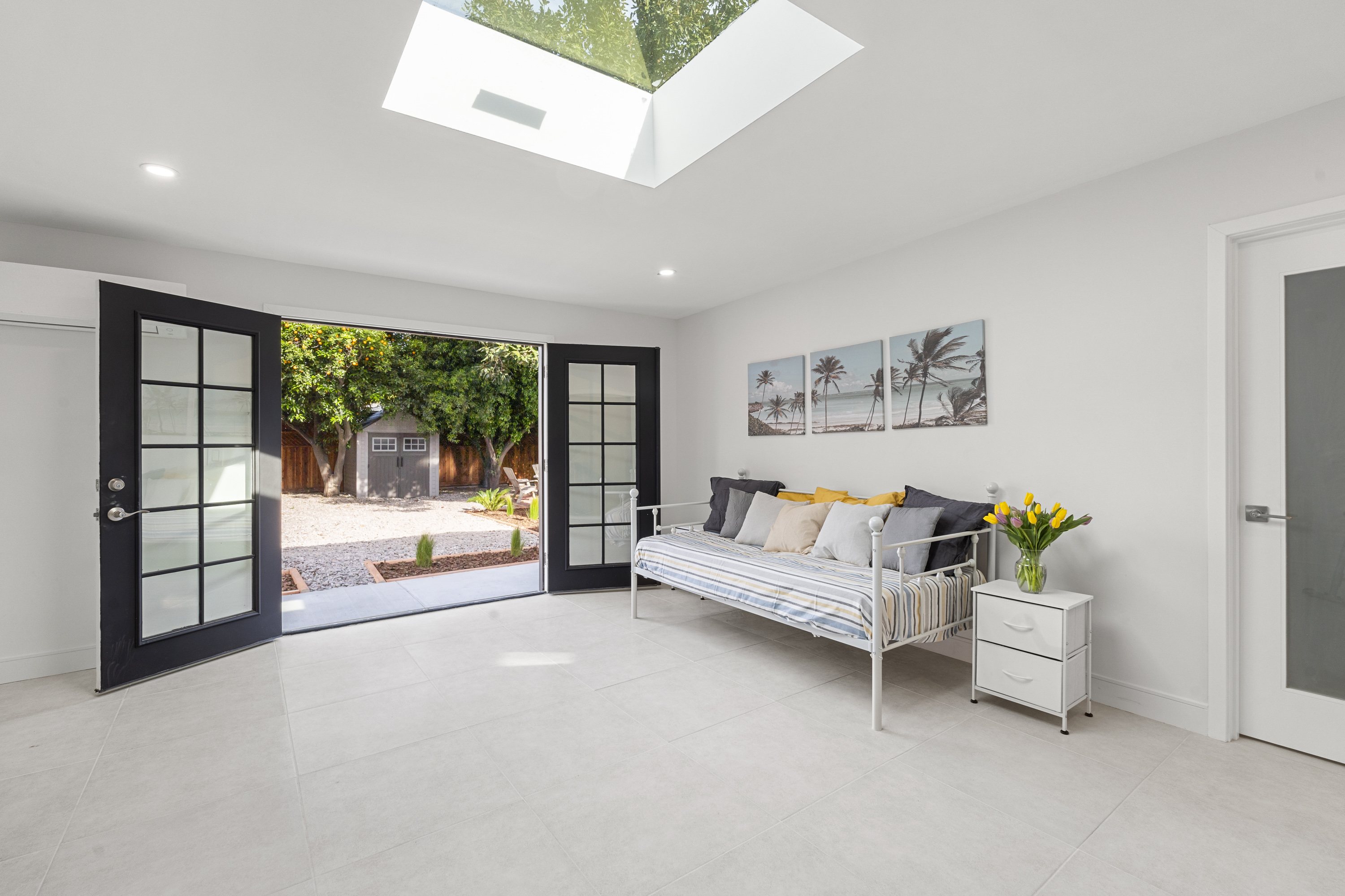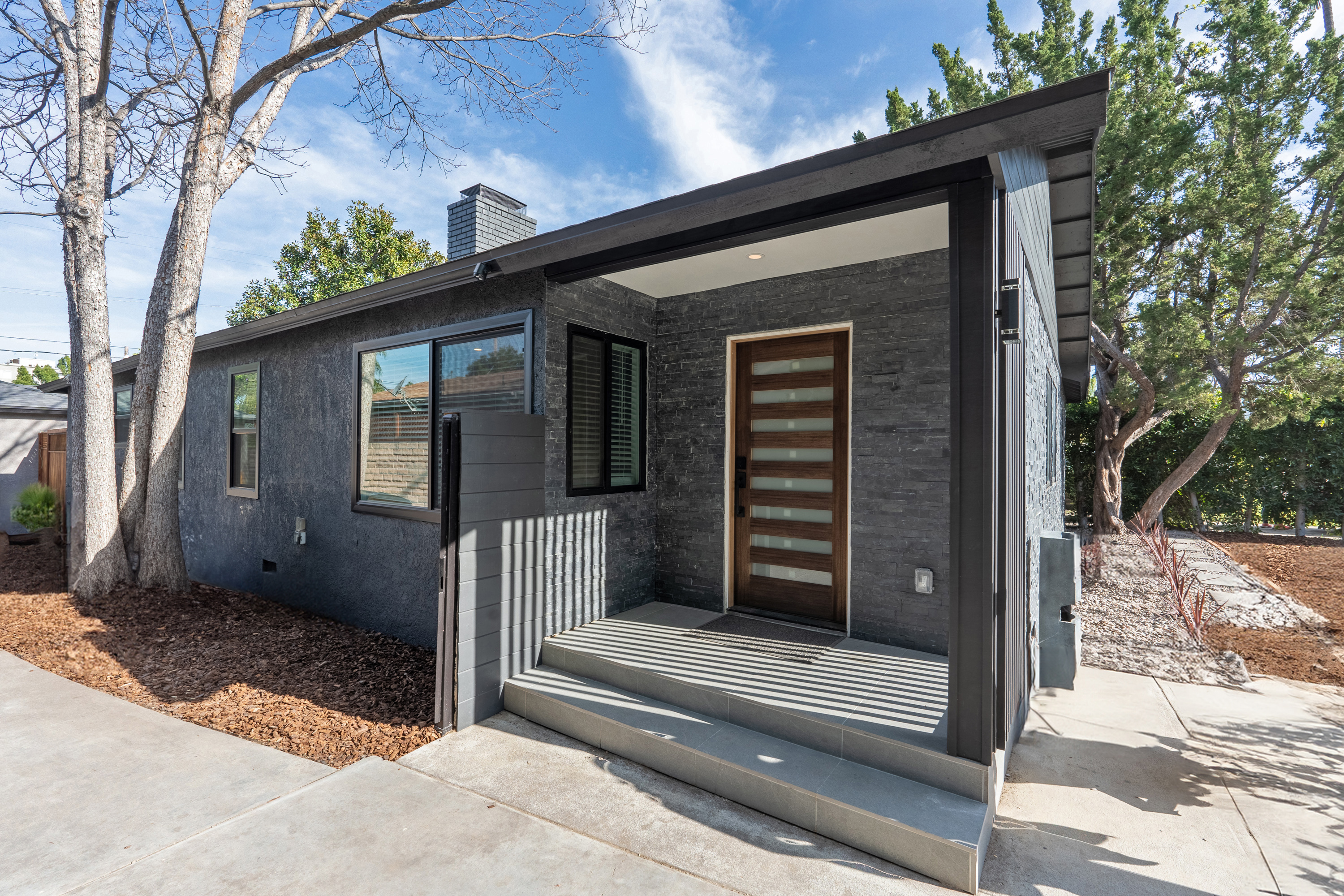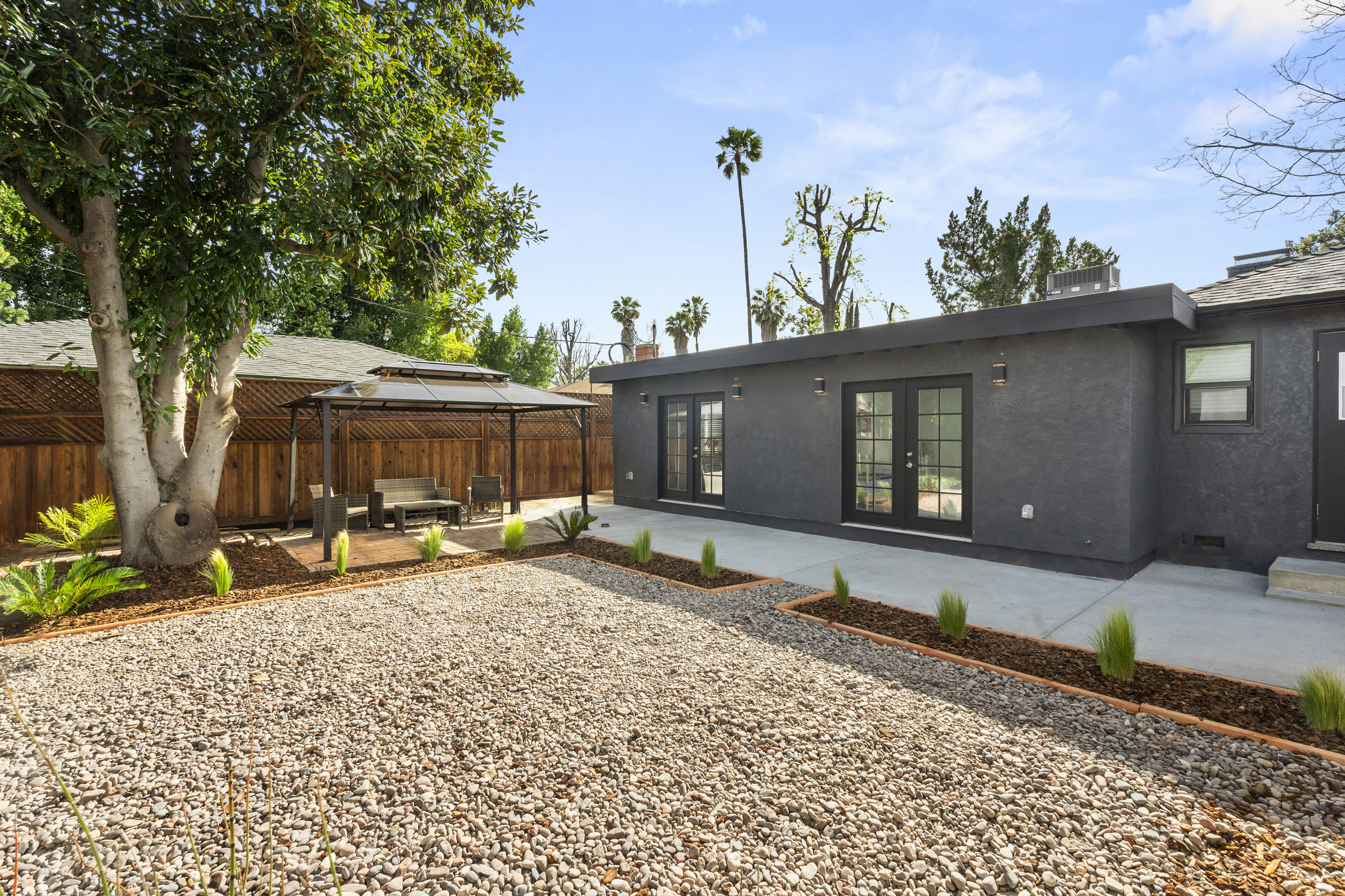 Welcome to 5432 Morella Ave. in sought after Valley Village. This beautifully remodeled residence boasts 5 bedrooms and 3.5 bathrooms of seamless contemporary style. Approach and enter through the main gate, to your very own private Urban Oasis and leave the world behind! Upon entering the approx. 2,146 main house, one is greeted by the abundance of natural sunlight that streams through new windows onto the porcelain tile floors. The 1st of the 2 fireplaces adorns the central Living Room. The dining area flows into the open concept kitchen, featuring all new appliances and quartz counter tops. The stepdown family room/great room features a dramatic stacked Ledger Stone fireplace. Continue through French doors into the ample sunroom with skylight. Additional French doors lead out to the backyard. The en-suite primary bedroom connects to what could be a nursery or home office with French doors out to the yard. Down the center hall you will find another bedroom and bath. Central heat and air ensuring year-round comfort, while mini splits provide personalized climate control in the back additions. The interiors exude warmth and openness, creating an inviting ambiance. The property also includes a sleek, beautifully remodeled approx. 635 sq. ft. 1 bedroom 1 bath ADU with its own private patio. The ADU has separate gated private entrance. This amazing enclave sits on an expansive 8100 square foot lot with an 8ft. privacy fence in the backyard and mature Fichus hedge in the front. Mature orange and tangerine trees and completed with xeriscape, creating a harmonious fusion of form and function requiring minimal maintenance and maximum beauty. This entertainer's paradise includes a perfectly placed gazebo to unwind beneath its sheltering canopy, while a fire pit area invites you to gather around its flickering flames sharing stories and laughter long into the night. This private retreat is perfect for intimate gatherings or peaceful moments, waiting to welcome you home.