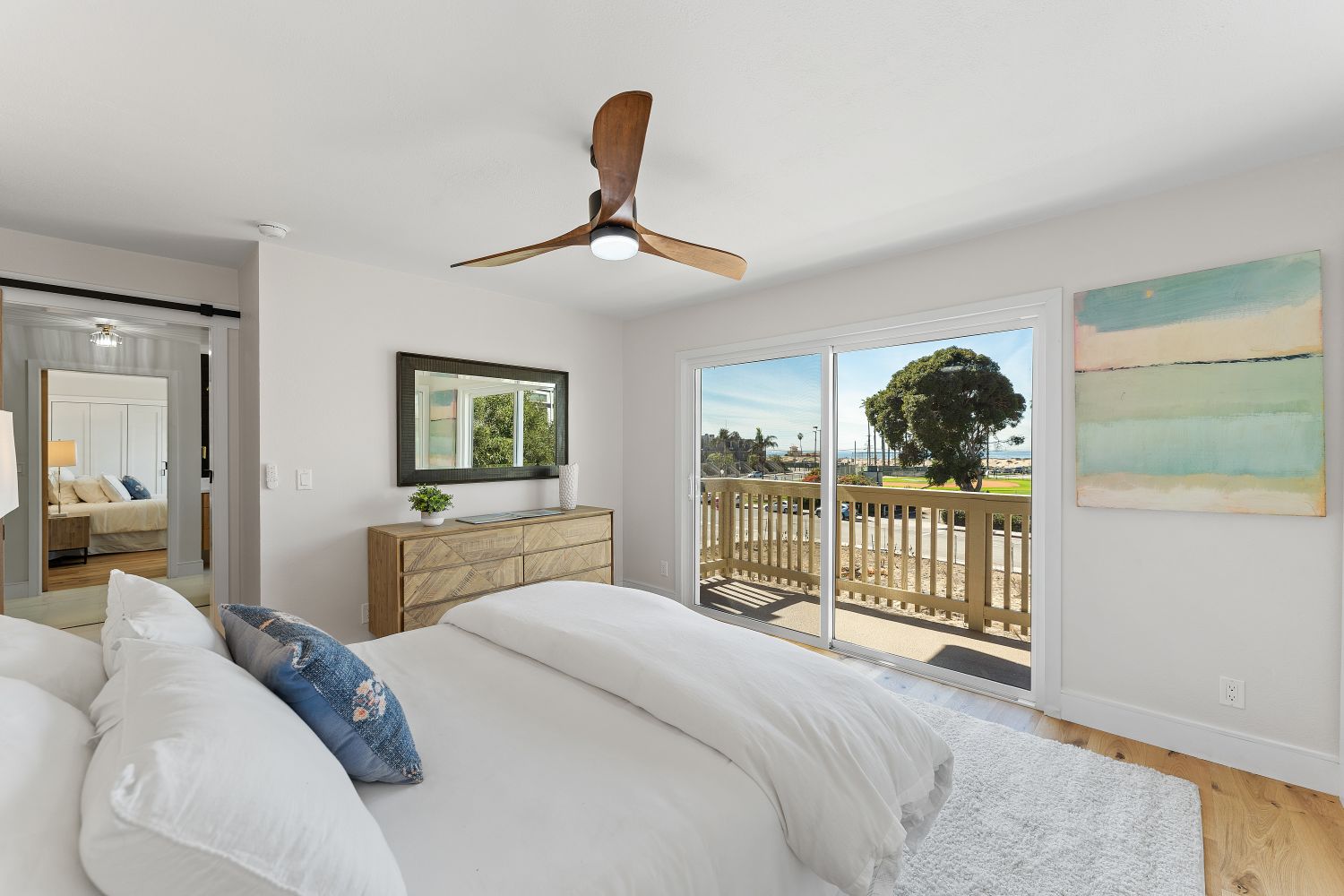 This fabulous 2 bed/2 ½ bath plus loft is almost 2,000 sq ft and has been painstakingly remodeled throughout with magnificent attention to detail. The living room has high ceilings, brick fireplace, balcony and amazing views of the park, beach and ocean. Opening into the living room is the exquisitely redone kitchen featuring quartz counters, new cabinets, tile backsplash, pendant lighting, Fisher Paykel fridge, Thor oven/stove, drawer microwave and a breakfast bar. Follow the stairs up to the loft that could be used as an office or convertible third bedroom which also features incredible ocean views. Just off of the loft is a private rooftop patio where you can sun bath and enjoy the wonderful coastal life while sipping on your favorite cocktail. The primary bedroom is spacious and has an oversized closet with built-ins as well as a balcony that also displays those marvelous ocean views. Open the barn door and you enter the en-suite bathroom that includes a stunning walk-in shower with frameless glass, dual sinks with quartz counters and sit-down vanity. This magnificent townhome also features a redone guest bathroom with quartz counters & new vanity, white oak engineered wood floors, double pane windows, new heating, in-unit laundry and side by side parking with additional storage in the garage. Walking distance to the beach, neighborhood park, lagoon and an abundance of restaurants, shops and cafés.