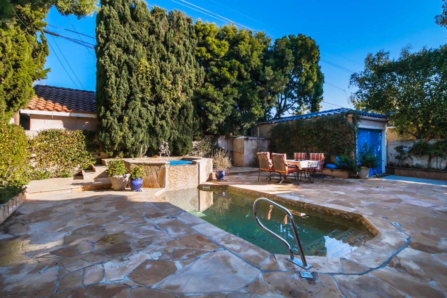 A beautiful, large, and private backyard with a heated, salt-water pool, jacuzzi, and cascading waterfall.